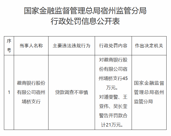 【大河财立方消息】12月16日,国家金融监督管理总局宿州监管分局披露的行政处罚信息公开表显示,因贷款调查不审慎,徽商银行股份有限公司宿州埇桥支行被罚45万元。
