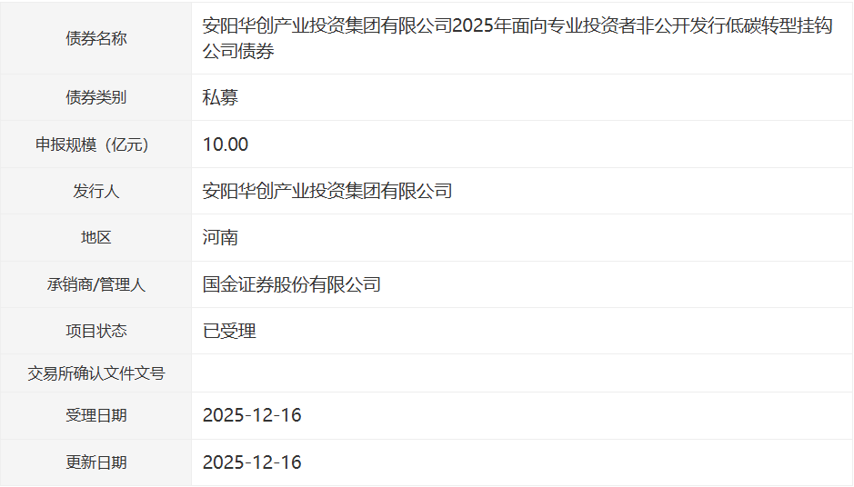【大河财立方消息】12月16日,安阳华创产业投资集团有限公司2025年面向专业投资者非公开发行低碳转型挂钩公司债券项目,获深交所受理。