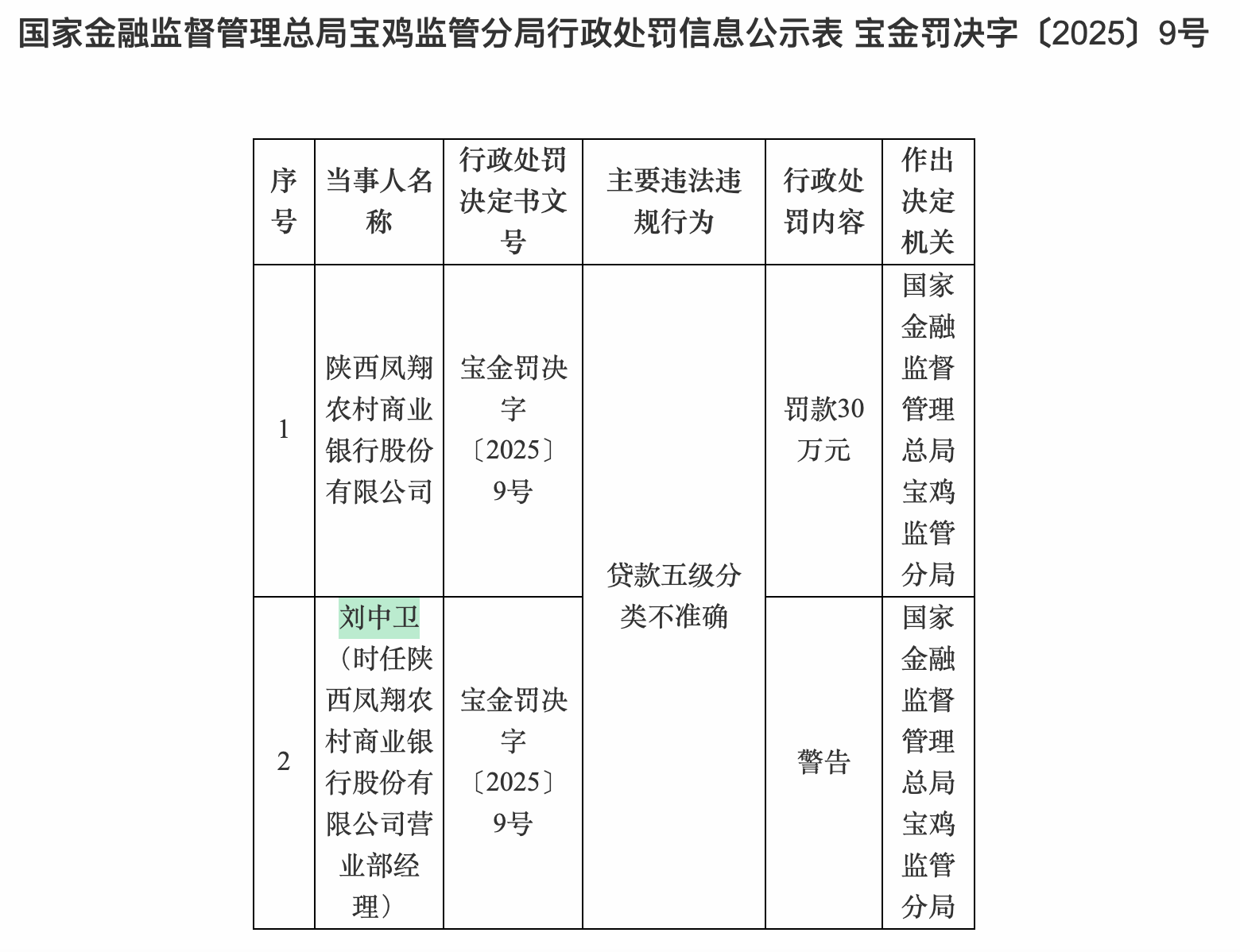 因贷款五级分类不准确,陕西凤翔农村商业银行被罚款30万元,时任该行营业部经理刘中卫被警告。