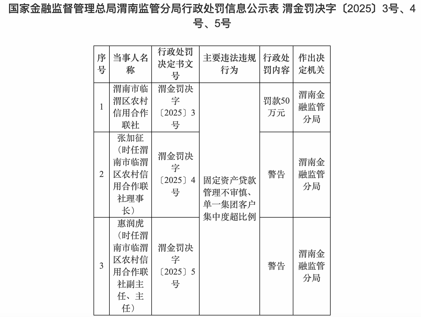 因固定资产贷款管理不审慎、单一集团客户集中度超比例,渭南市临渭区农村信用合作联社被罚款50万元。时任渭南市临渭区农村信用合作联社理事长张加征,时任副主任、主任惠润虎二人被警告。