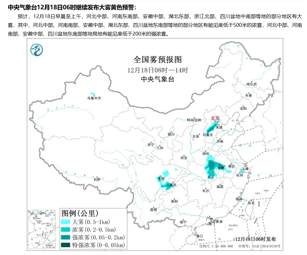 预计,12月18日早晨至上午,河北中部、河南东南部、安徽中部、湖北东部、浙江北部、四川盆地中南部等地的部分地区有大雾,其中,河北中部、河南南部、安徽中部、湖北东部、四川盆地东南部等地的部分地区有能见度低于500米的浓雾,河北中部、河南南部、安徽中部、四川盆地东南部等地局地有能见度低于200米的强浓雾。