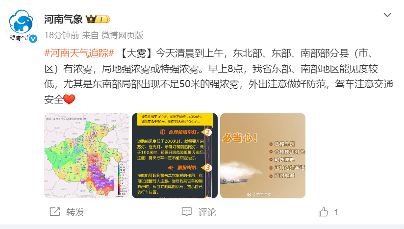 今天清晨到上午,东北部、东部、南部部分县(市、区)有浓雾,局地强浓雾或特强浓雾。早上8点,河南东部、南部地区能见度较低,尤其是东南部局部出现不足50米的强浓雾,外出注意做好防范,驾车注意交通安全。