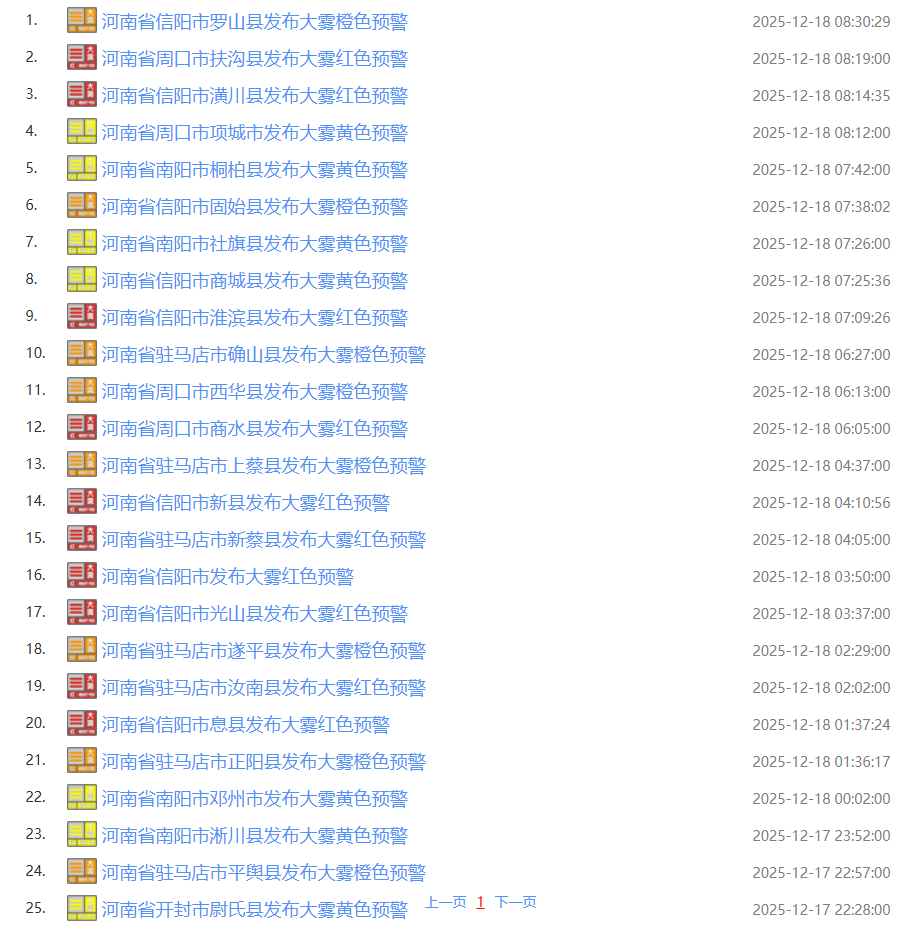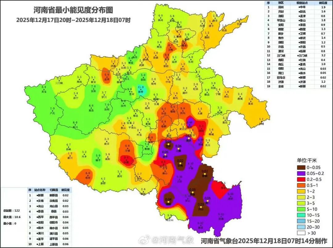 12月18日,据河南发布,河南周口扶沟县、信阳潢川县、驻马店新蔡县等多地发布大雾红色预警,部分区域能见度小于50米。