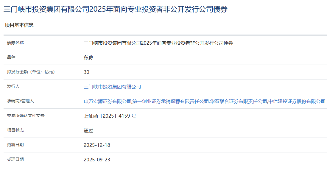 【大河财立方消息】12月18日,三门峡市投资集团有限公司2025年面向专业投资者非公开发行公司债券获上交所通过。该债券拟发行金额30亿元,承销商/管理人为申万宏源证券、第一创业证券承销保荐公司、华泰联合证券和中信建投。2025年6月26日,经中诚信国际综合评定,发行人主体信用评级为AA+,展望稳定。