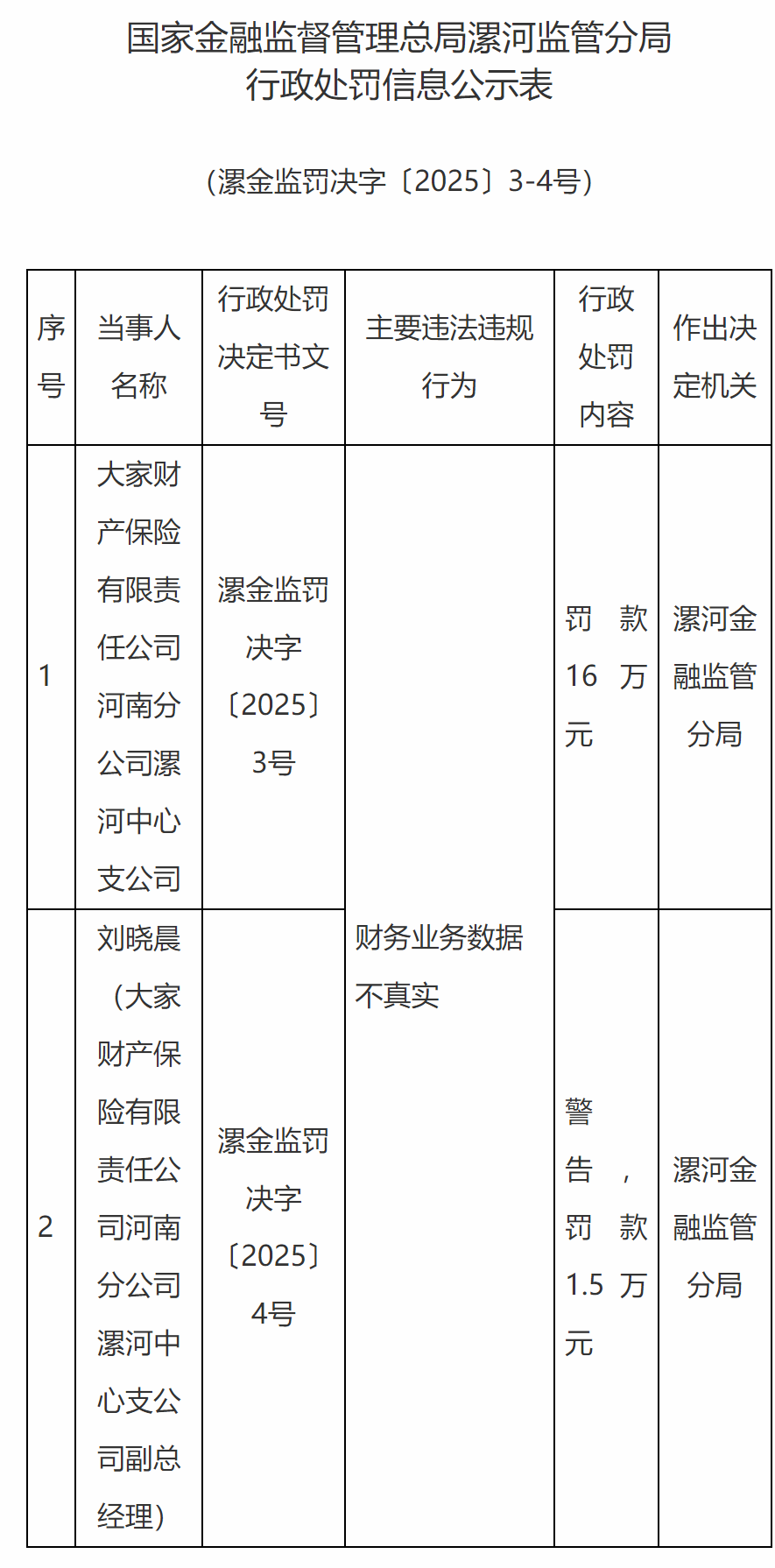 同时,漯河金融监管分局对大家财产保险有限责任公司河南分公司漯河中心支公司副总经理刘晓晨警告,并罚款1.5万元。