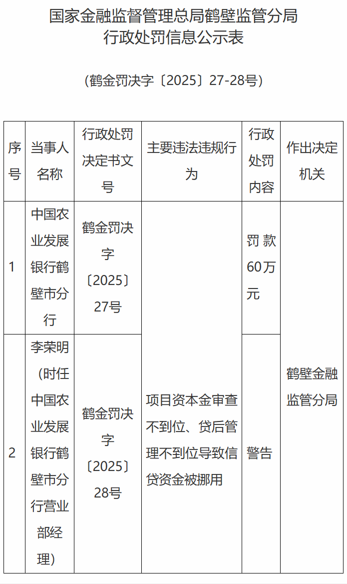 【大河财立方消息】12月19日,国家金融监督管理总局鹤壁监管分局披露的行政处罚信息公示表显示,因项目资本金审查不到位、贷后管理不到位导致信贷资金被挪用,中国农业发展银行鹤壁市分行被罚60万元。