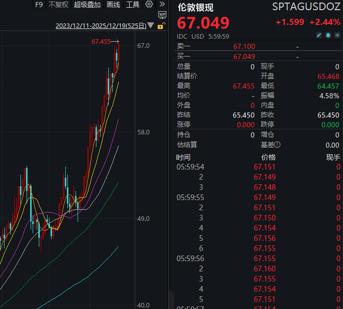 【大河财立方消息】12月20日消息,现货白银日内上涨2.44%,突破67美元/盎司,刷新历史纪录。
