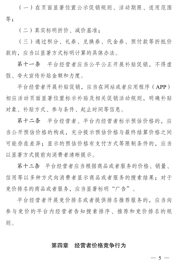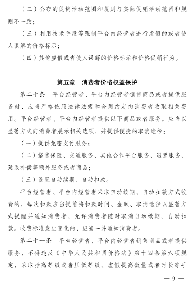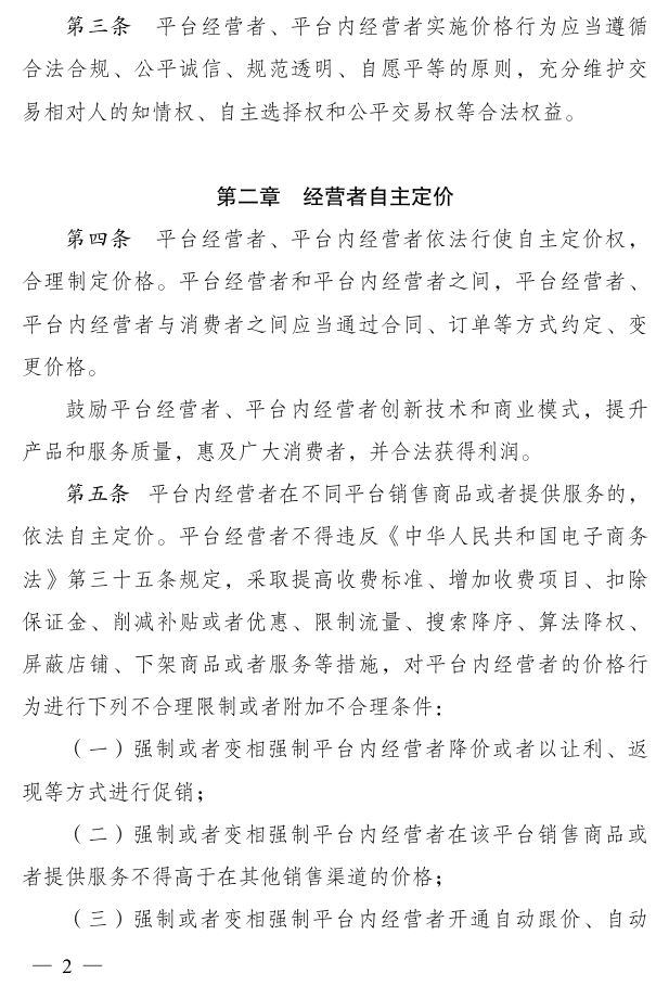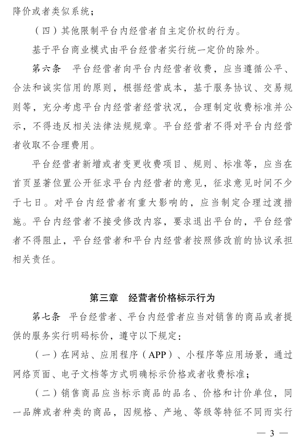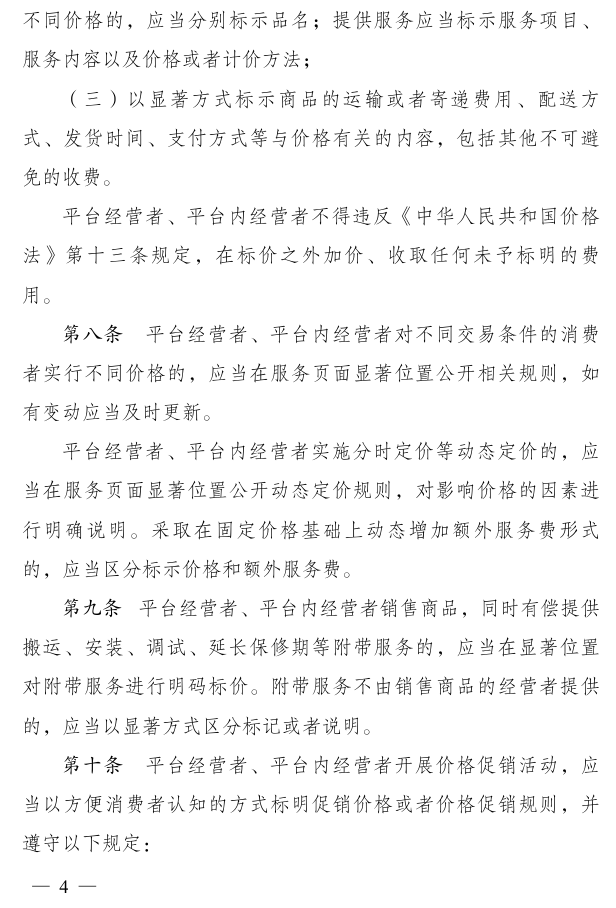 平台经营者、平台内经营者不得违反《中华人民共和国消费者权益保护法实施条例》第九条规定,在消费者不知情的情况下,基于支付意愿、支付能力、消费偏好、消费习惯等信息,运用数据和算法、平台规则等手段,对同一商品或者服务在同等交易条件下设置不同的价格或者收费标准。
