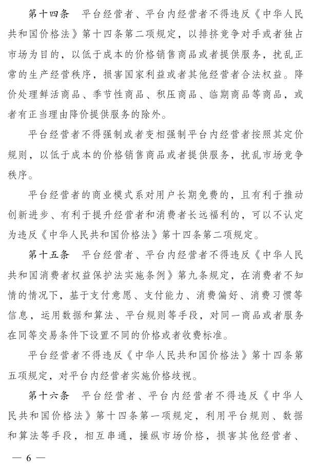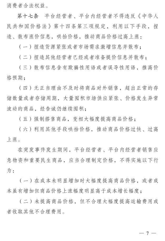 平台经营者、平台内经营者不得违反《中华人民共和国价格法》第十四条第三项规定,利用以下手段,捏造、散布涨价信息,哄抬价格,推动商品价格过高上涨: