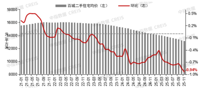 根据中国房地产指数系统百城价格指数,2025年11月,百城二手住宅均价环比下跌0.94%,同比下跌7.95%;十大城市二手住宅均价环比下跌1.17%,同比下跌6.32%。