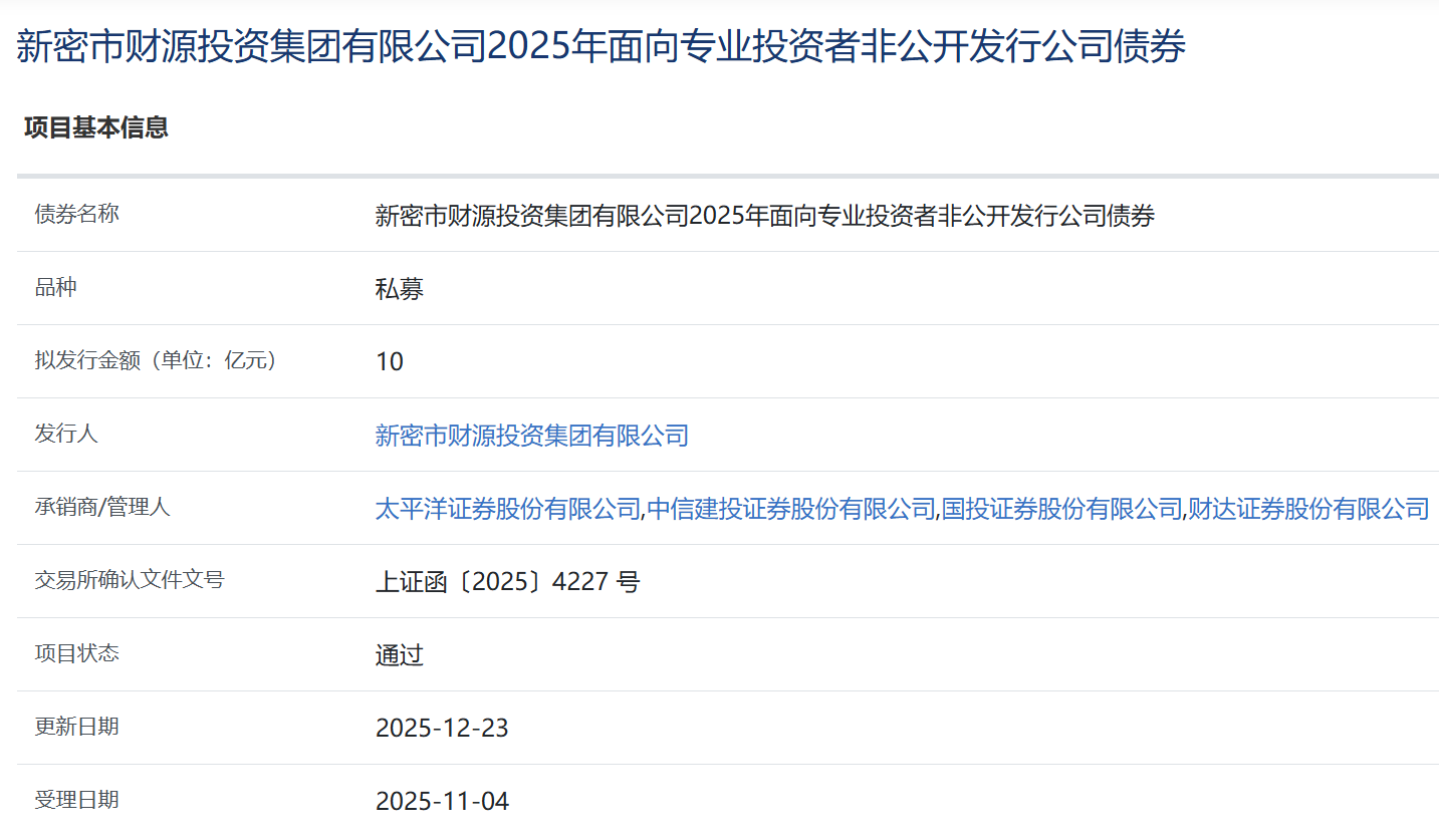 【大河财立方消息】12月23日,新密市财源投资集团有限公司2025年面向专业投资者非公开发行公司债券项目获上交所通过。本期债券拟发行规模10亿元,承销商/管理人为太平洋证券、中信建投证券、国投证券、财达证券。