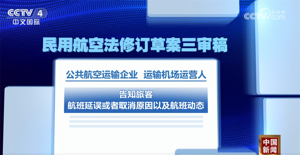 民用航空法修订草案提请全国人大常委会会议三次审议。针对航班延误、取消这一群众关心的问题,草案三审稿增加规定,公共航空运输企业、运输机场运营人应当合理安排运力、调配资源,加强对设施设备的检查和维护,减少因自身原因导致的航班延误或者取消;同时,要求公共航空运输企业、运输机场运营人及时、准确发布信息通告,告知旅客航班延误或者取消原因以及航班动态。