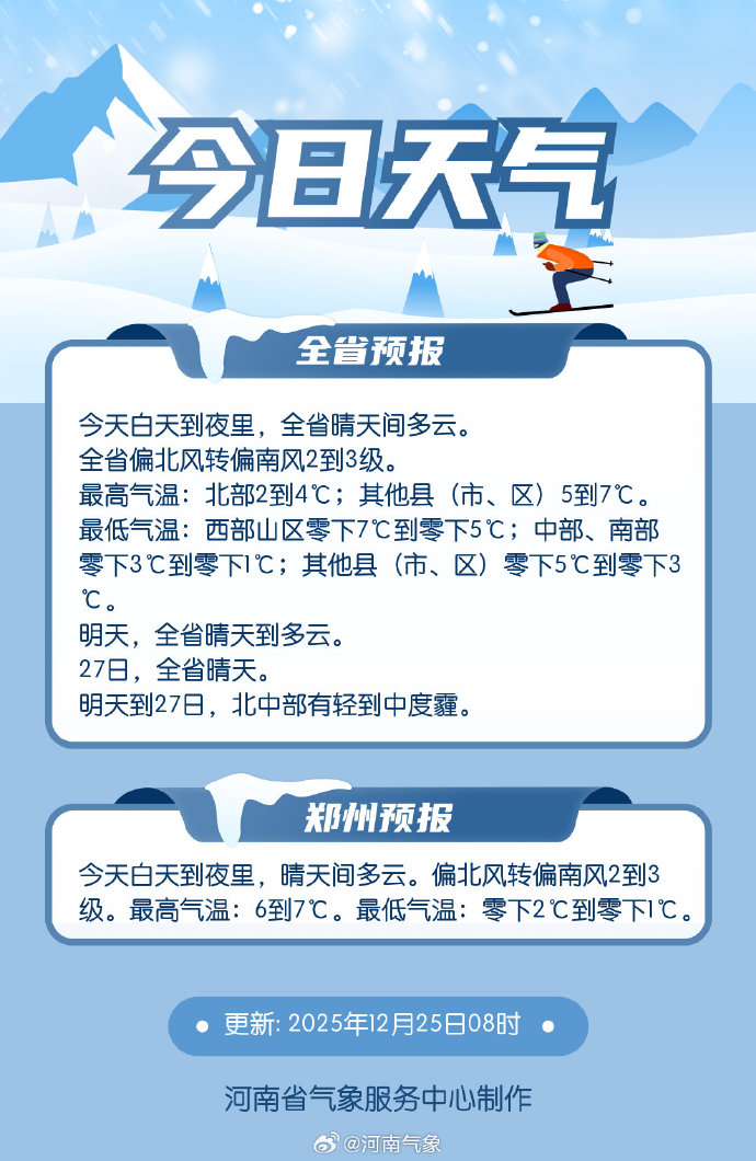 12月25日,据河南发布,今明两天,河南河南省的气温将触及近期的谷底。受弱冷空气持续影响,除南部部分地区外,河南省大部最高气温将维持在5℃上下,最低气温更是持续在冰点以下徘徊。
