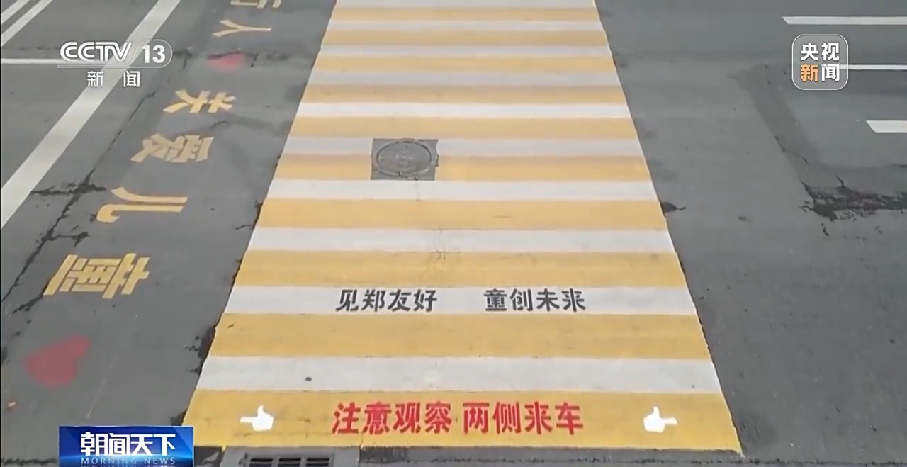 记者分别在中原区、惠济区的小学门口看到,斑马线搭配“见郑友好 童创未来”童趣标语。