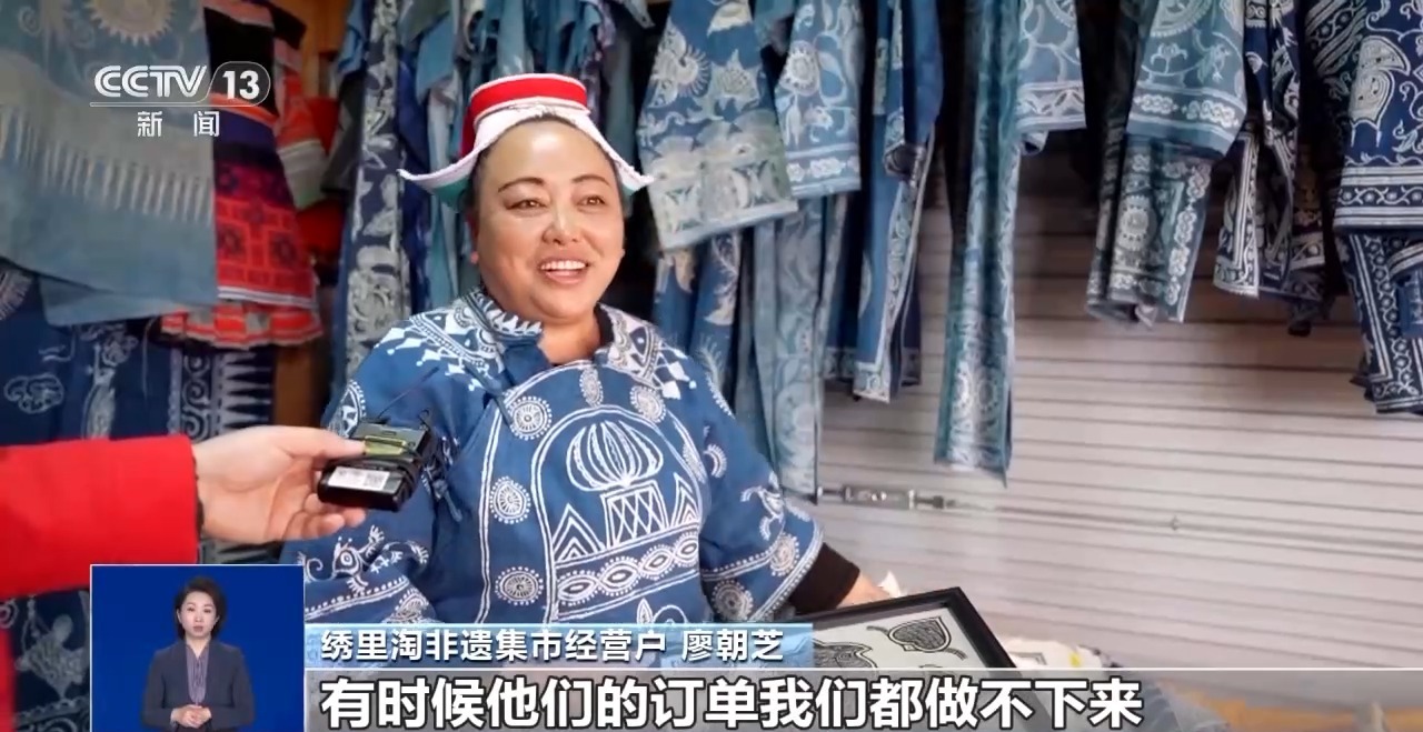 绣里淘非遗集市经营户廖朝芝:我们家主要是卖蜡染。顾客很喜欢,有时候给我们介绍订单,有时候他们的订单我们都做不下来。
