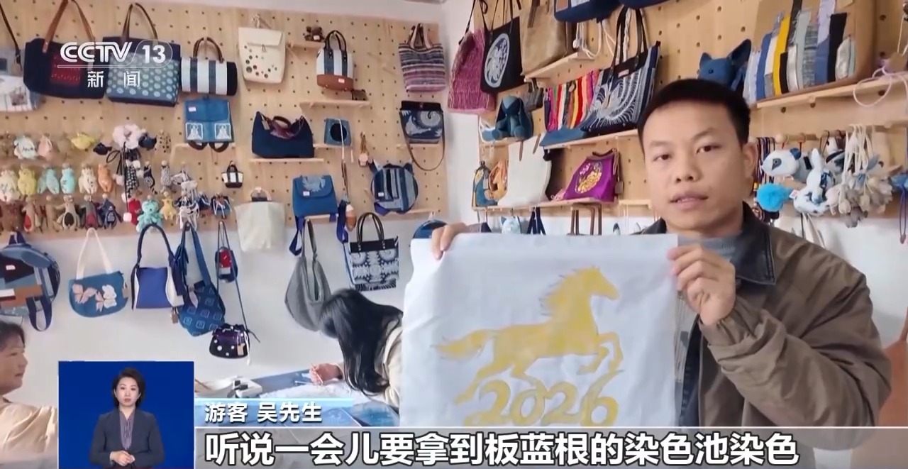 游客吴先生:我画的是一幅奔马,听说一会儿要拿到板蓝根的染色池染色,脱蜡以后做成方巾。明年是2026年,祝大家马到成功。