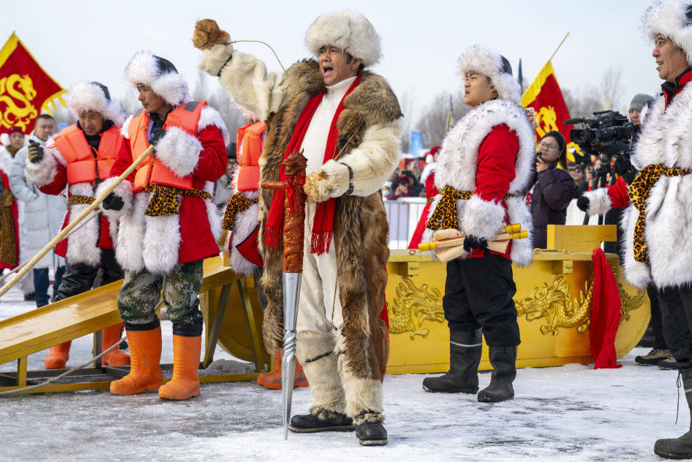 ↑2025年12月7日,在第六届哈尔滨采冰节现场,“冰把头”带领“采冰汉子”去采头冰。