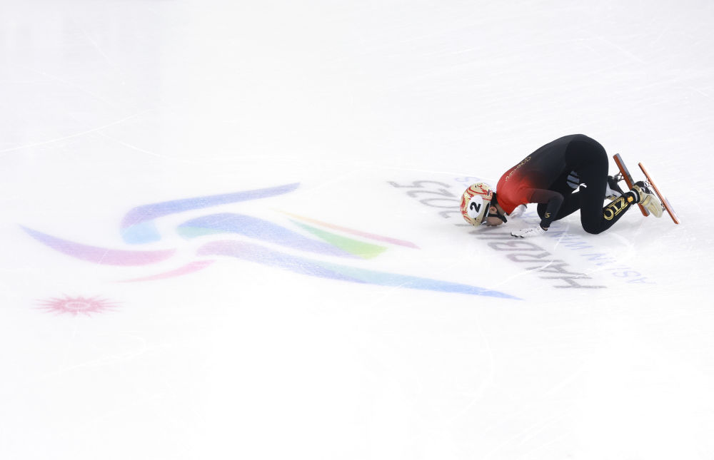 ↑2月9日,在第九届亚冬会短道速滑女子3000米接力A组决赛后,获得冠军队的中国队选手范可新申请亲吻冰面。这是范可新最后一次参加亚冬会。新华社记者 许雅楠 摄