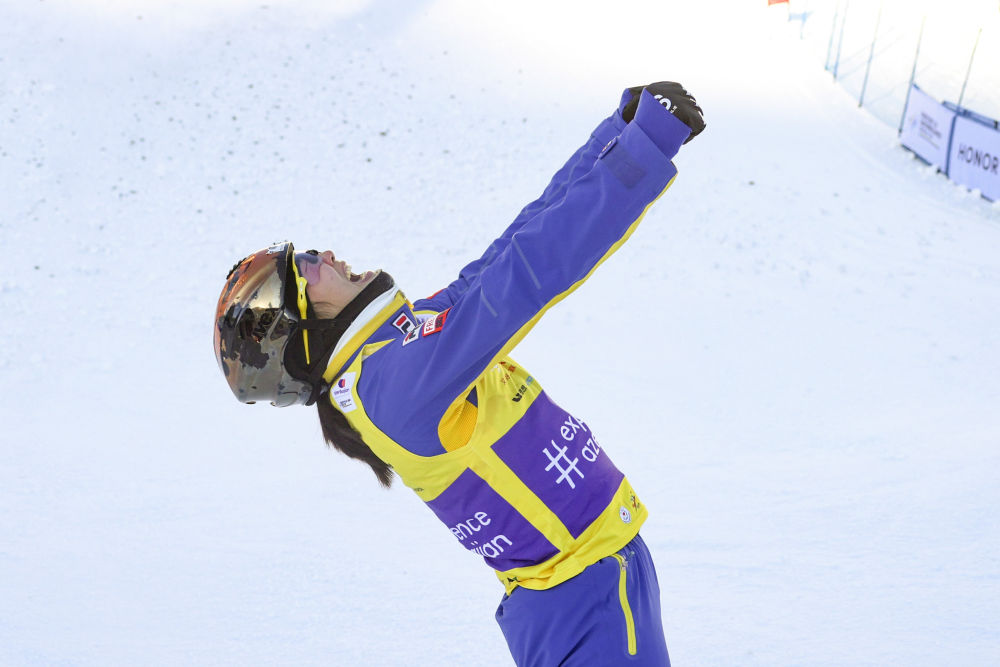 ↑12月20日,中国选手徐梦桃在河北省张家口市崇礼区云顶滑雪场进行的国际雪联自由式滑雪空中技巧世界杯(云顶站)女子组决赛中庆祝。最终,她获得季军。新华社发(武殿森摄)