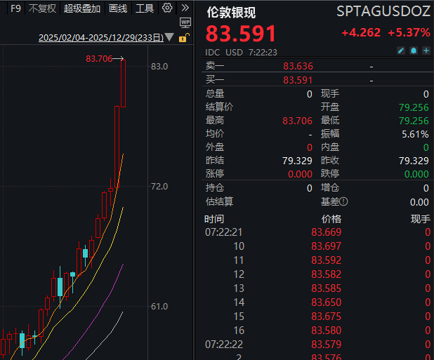 【大河财立方消息】12月29日,现货白银开盘快速拉升,涨超5%,突破80美元关口,报83.591美元/盎司,继续刷新历史新高。
