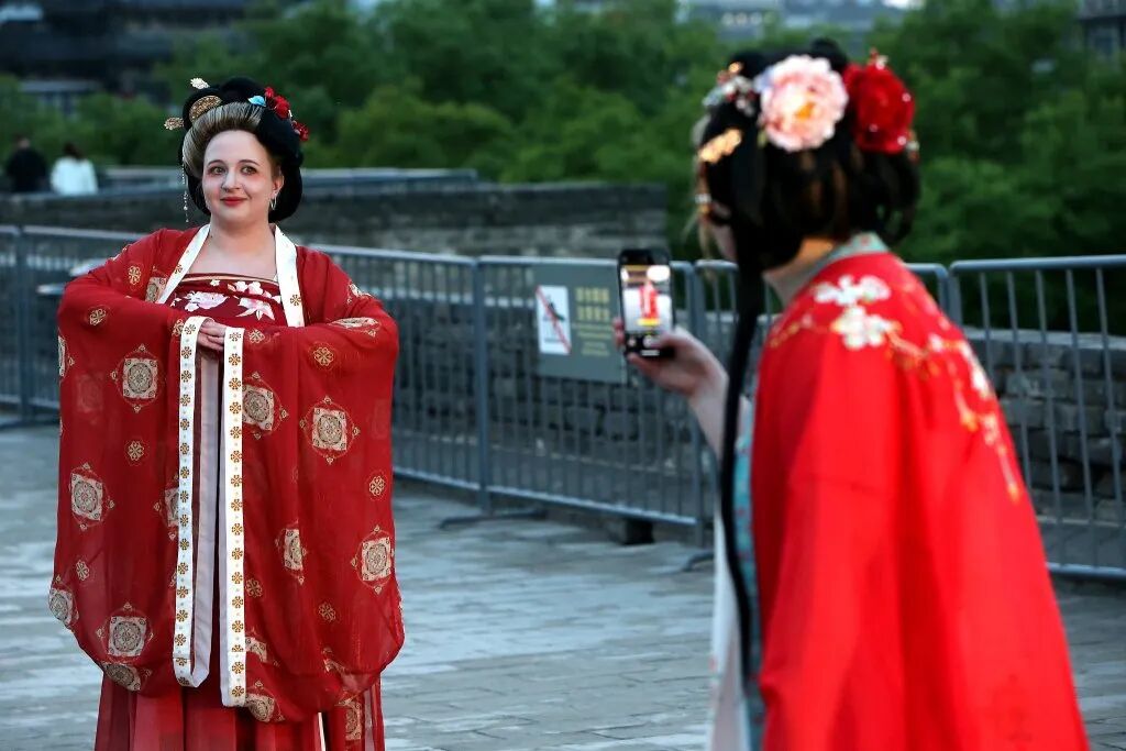 两位外国游客身着唐朝服饰拍照