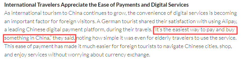文章分析说,随着中国国际旅游业的持续增长,数字服务的便利性正成为外国游客考虑的重要因素。一位德国游客分享了他对使用中国领先的数字支付平台的满意度。他说:“这是在中国支付和购物最简单的方式。”他说,这种便捷的支付方式使外国游客更容易在中国城市中导航、购物和享受服务,而不用担心货币兑换问题。支付方式和其他服务的数字化正使中国作为旅游目的地的吸引力越来越大。