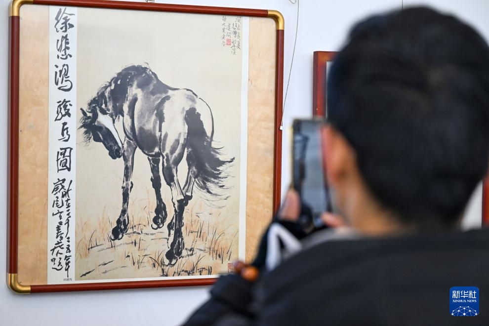 12月29日,参观者在天津古文化街参观“喜迎马年,五代画马人马画艺术展”。新华社记者 赵子硕 摄