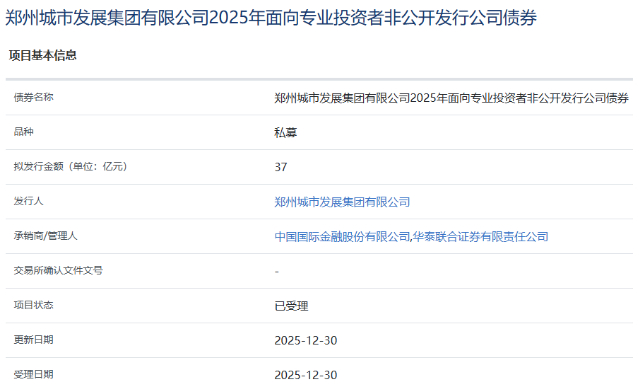 【大河财立方消息】12月30日,郑州城市发展集团有限公司2025年面向专业投资者非公开发行公司债券项目获上交所受理。债券拟发行金额37亿元,承销商/管理人为中金公司、华泰联合证券。2025年6月19日,经联合资信综合评定,发行人主体信用评级为AAA,展望稳定。