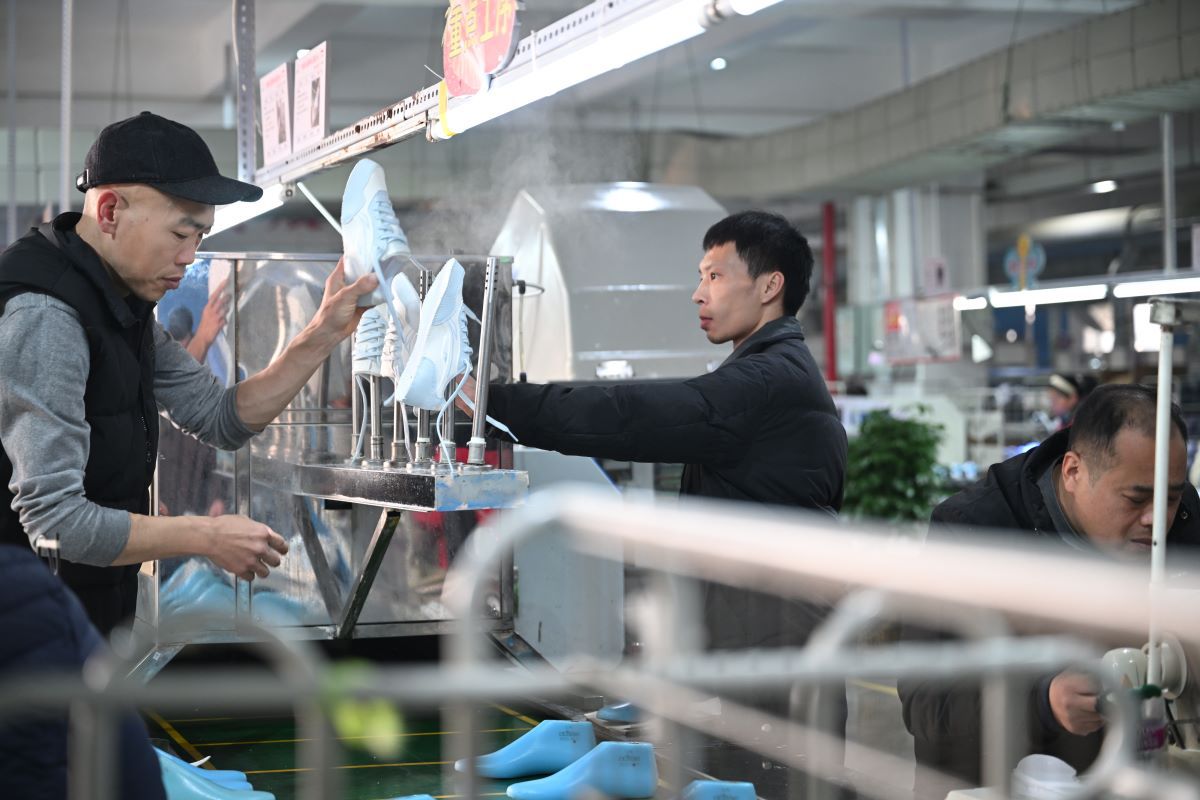 河南红晟鞋业有限公司车间内,工人们正为国内某知名一线品牌代工生产运动鞋