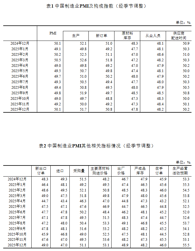 【大河财立方消息】12月31日,国家统计局发布2025年12月中国采购经理指数运行情况。