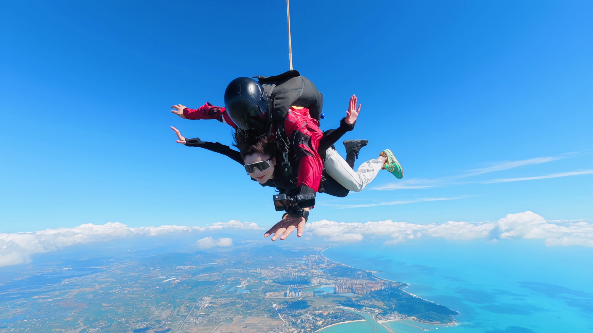 央广网三亚12月30日消息(记者 索迪)直升机舱门打开,海风裹挟着4000米高空的凉意扑面而来,开伞绳绷紧的瞬间,失重感退去,取而代之的是一种漂浮在云端的轻盈——这是在海南省三亚市海棠湾高空跳伞,与大海相遇的全新姿势。
