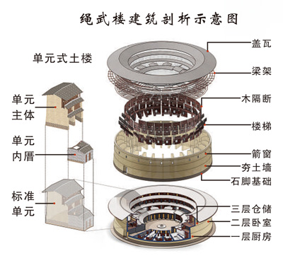 土楼有着严谨的营建工序,大致有选址定位、基础砌筑、夯筑土墙、竖柱献架、出水盖瓦、内外装修等步骤。
