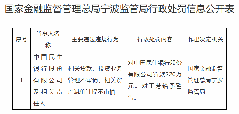 【大河财立方消息】2025年12月31日,国家金融监督管理总局宁波监管局披露的行政处罚信息公开表显示,因相关贷款、投资业务管理不审慎,相关资产减值计提不审慎,中国民生银行股份有限公司被罚220万元。