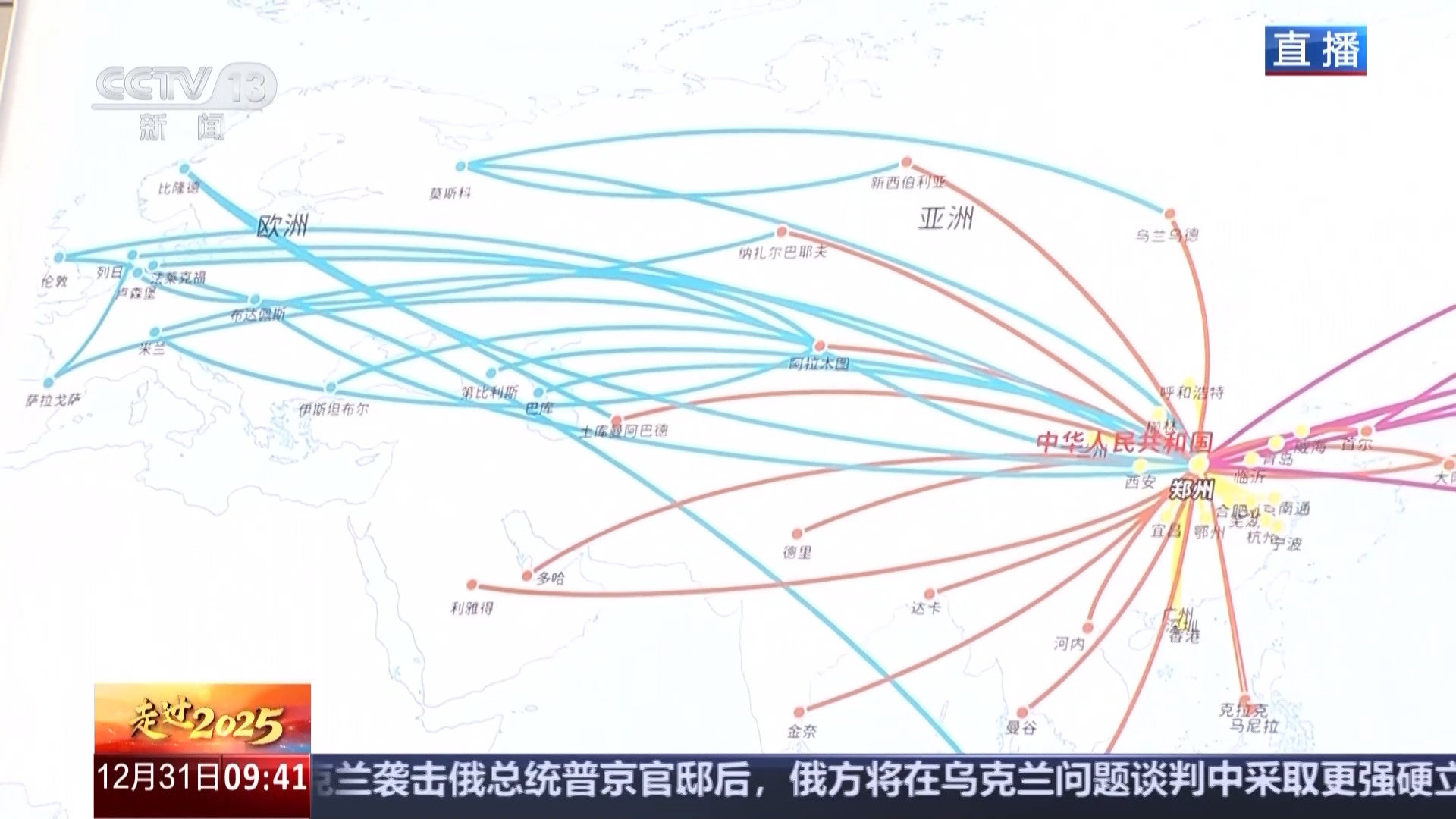 这里有一张图,这上面五颜六色的货运航线以郑州为中心,放射到世界各地,其中蓝色的线路是连接欧洲的,有18个航点,橙色的线路连接亚洲,有23个航点,而紫色的线路连接美洲,有9个航点。这50条纯货运的航线,构建起了联结欧、美、亚三大洲的空中骨干通道。除此之外,我们仔细看这张图里黄颜色的线路,它们就是以郑州为中心辐射全国的国内货运航线。在今年12月21日,新郑国际机场的年货邮吞吐量超过了100万吨,正式跻身全球百万吨级货运枢纽的行列。