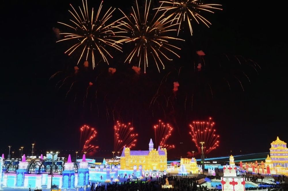 2025年12月31日,哈尔滨冰雪大世界举行跨年夜烟花表演。(哈尔滨冰雪大世界供图)