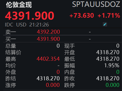 【大河财立方消息】1月2日,现货黄金向上触及4400美元/盎司,日内上涨1.89%。截至发稿,现货黄金回落至4391.900美元/盎司,日内上涨1.71%。