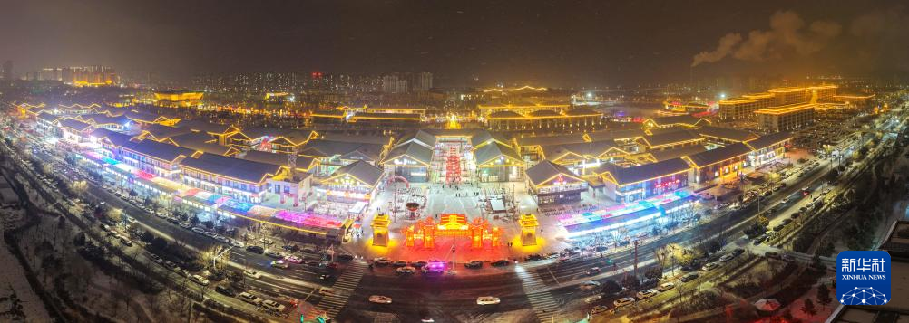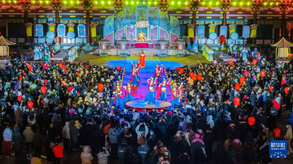 1月1日,游客在山东乐陵影视城景区观看表演(无人机照片)。新华社发(贾鹏 摄)