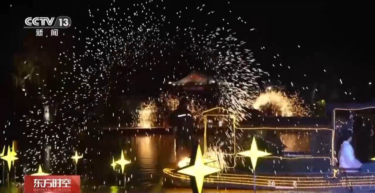 夜幕降临,泉水灯光秀、打铁花等项目轮番上演。光影交织间,古城韵味与节日氛围拉满,引得游人驻足观赏。