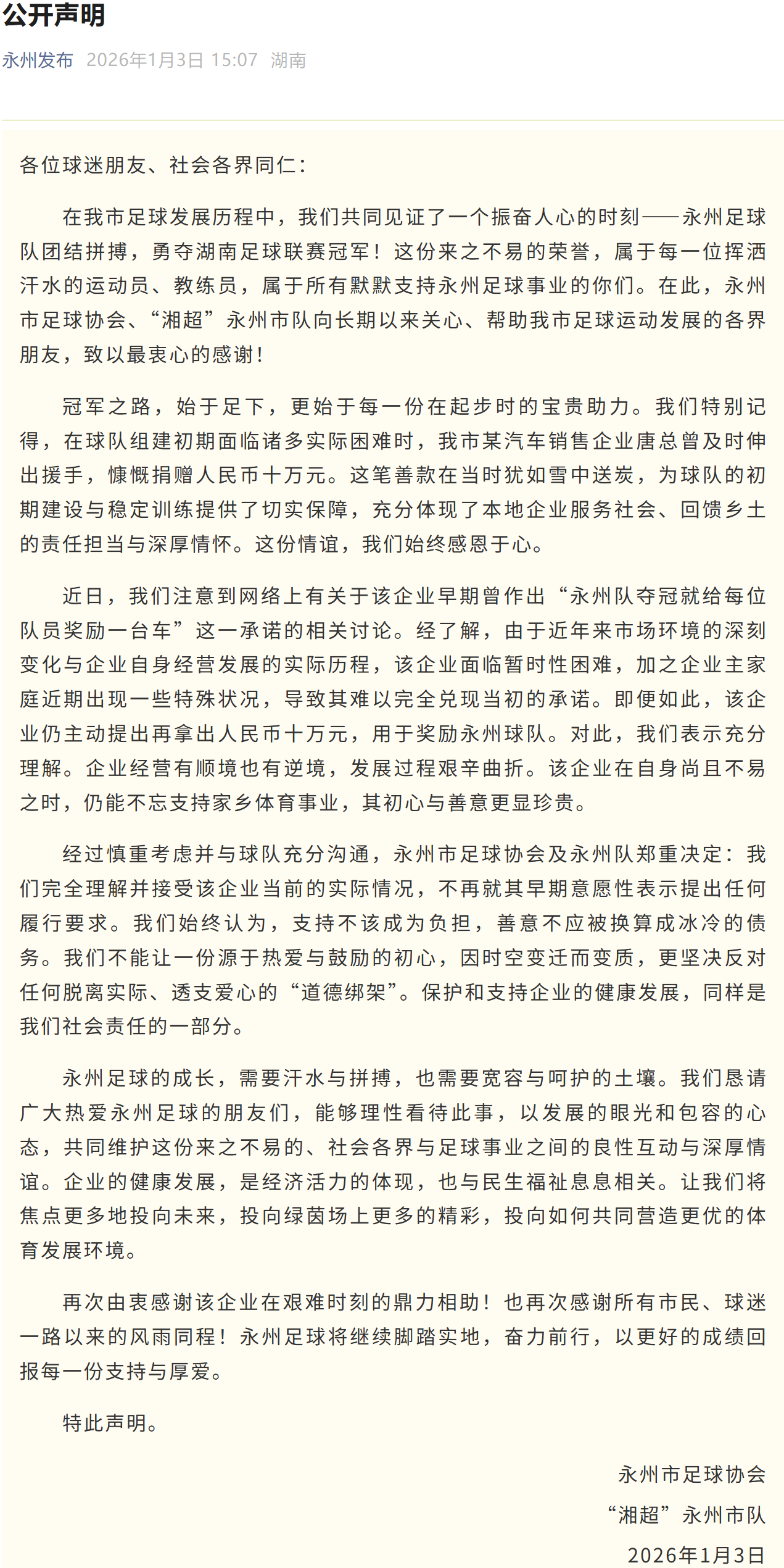 【大河财立方消息】1月3日,永州市足球协会、“湘超”永州市队发布公开声明,回应永州市某汽车销售企业唐某曾表示“永州队夺冠就给每位队员奖励一台车”这一承诺的相关讨论。