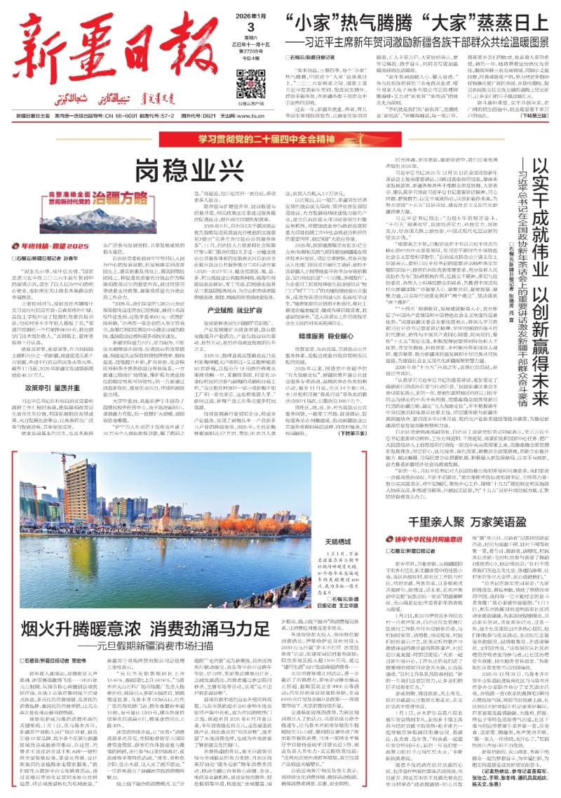 “民生无小事,枝叶总关情。”国家主席习近平在二〇二六年新年贺词中的深情话语,道出了以人民为中心的初心使命,也映照出天山南北各族群众的幸福图景。