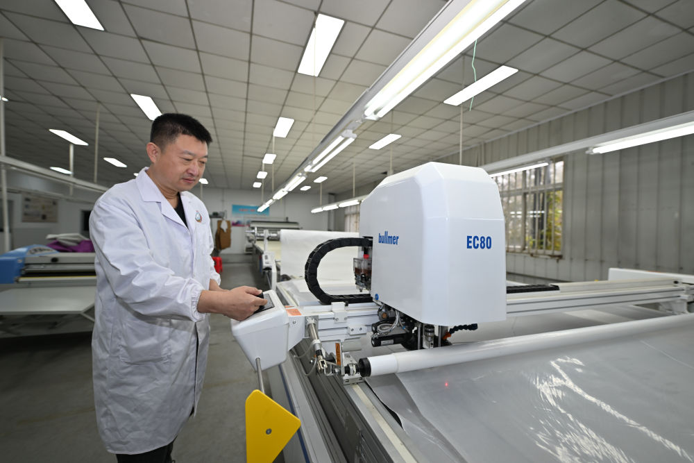 工人在天津纺织集团(控股)有限公司智能化生产车间内操作自动切布机。新华社记者孙凡越 摄