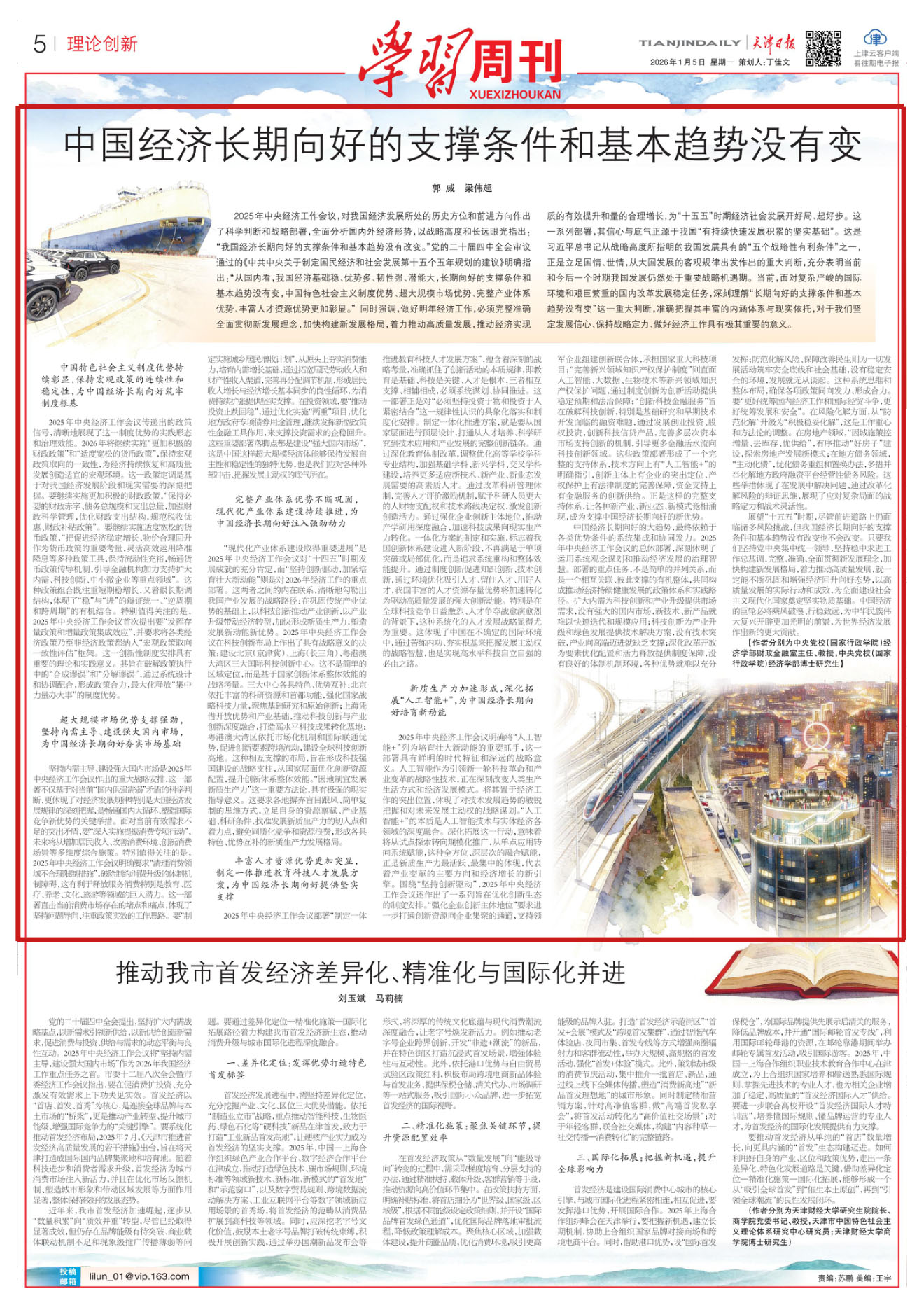 2025年中央经济工作会议,对我国经济发展所处的历史方位和前进方向作出了科学判断和战略部署,全面分析国内外经济形势,以战略高度和长远眼光指出:“我国经济长期向好的支撑条件和基本趋势没有改变。”党的二十届四中全会审议通过的《中共中央关于制定国民经济和社会发展第十五个五年规划的建议》明确指出:“从国内看,我国经济基础稳、优势多、韧性强、潜能大,长期向好的支撑条件和基本趋势没有变,中国特色社会主义制度优势、超大规模市场优势、完整产业体系优势、丰富人才资源优势更加彰显。”同时强调,做好明年经济工作,必须完整准确全面贯彻新发展理念,加快构建新发展格局,着力推动高质量发展,推动经济实现质的有效提升和量的合理增长,为“十五五”时期经济社会发展开好局、起好步。这一系列部署,其信心与底气正源于我国“有持续快速发展积累的坚实基础”。这是习近平总书记从战略高度所指明的我国发展具有的“五个战略性有利条件”之一,正是立足国情、世情,从大国发展的客观规律出发作出的重大判断,充分表明当前和今后一个时期我国发展仍然处于重要战略机遇期。当前,面对复杂严峻的国际环境和艰巨繁重的国内改革发展稳定任务,深刻理解“长期向好的支撑条件和基本趋势没有变”这一重大判断,准确把握其丰富的内涵体系与现实依托,对于我们坚定发展信心、保持战略定力、做好经济工作具有极其重要的意义。