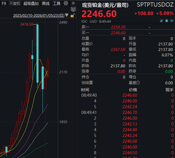 【大河财立方消息】1月5日,现货铂金上涨逾5%至每盎司2246.60美元。