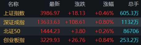【大河财立方消息】1月5日,A股2026年第一个交易日,三大指数集体高开,其中沪指涨0.46%报3986.97点,深成指涨0.8%报13633.63点,创业板涨0.84%报3229.93点。