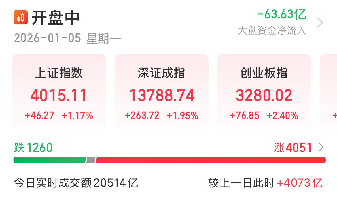 【大河财立方消息】1月5日午后,沪深北三市成交额突破2万亿元。截至发稿,较上一交易日此时放量超4000亿元。