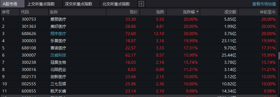 截至发稿,爱朋医疗、翔宇医疗、美好医疗、三博脑科、乐普医疗、创新医疗、三七互娱涨停,赛诺医疗、冠昊生物、汉威科技涨超15%。