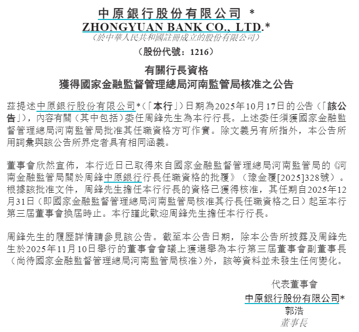 【大河财立方消息】1月5日,中原银行公告称,该行近日已取得来自国家金融监督管理总局河南监管局的《河南金融监管局关于周锋中原银行行长任职资格的批复》。根据该批准文件,周锋担任中原银行行长的资格已获核准,其任期自2025年12月31日(即国家金融监督管理总局河南监管局核准其行长任职资格之日)起至该行第三届董事会换届时止。