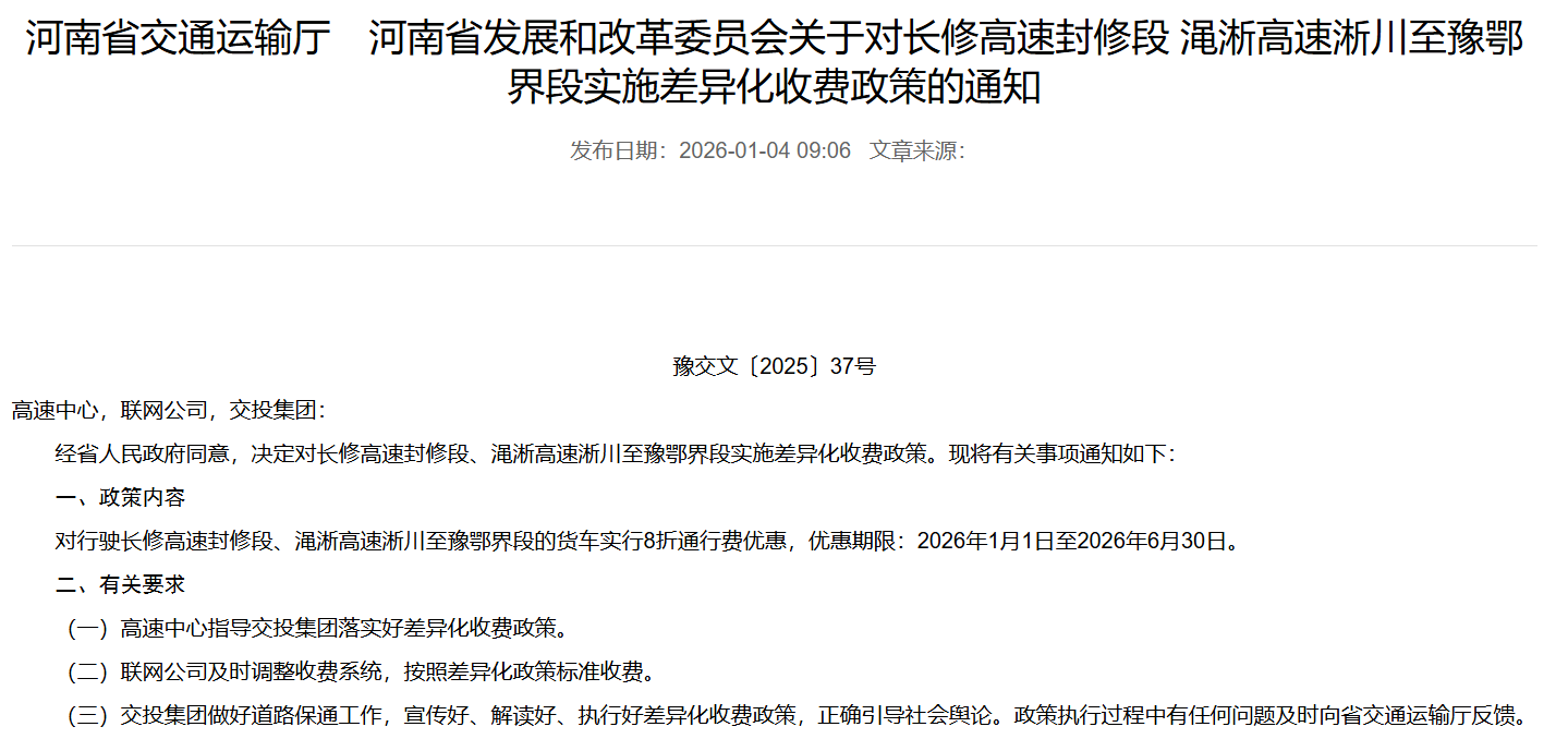 通知明确,经省人民政府同意,决定对行驶长修高速封修段、渑淅高速淅川至豫鄂界段的货车实行8折通行费优惠,优惠期限为2026年1月1日至2026年6月30日。