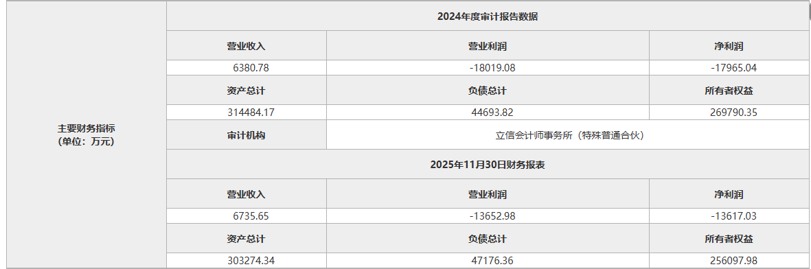 财务方面,航天科工火箭2024年度营业收入6380.78万元,亏损1.8亿元;2025年前11月,公司营业收入6735.65万元,亏损1.36亿元。截至2025年11月末,公司总资产30.33亿元,所有者权益25.61亿元。