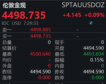 【大河财立方消息】1月7日,现货黄金向上触及4500美元,日内上涨0.12%。截至发稿,现货黄金报4498.735美元/盎司,日内上涨0.09%。